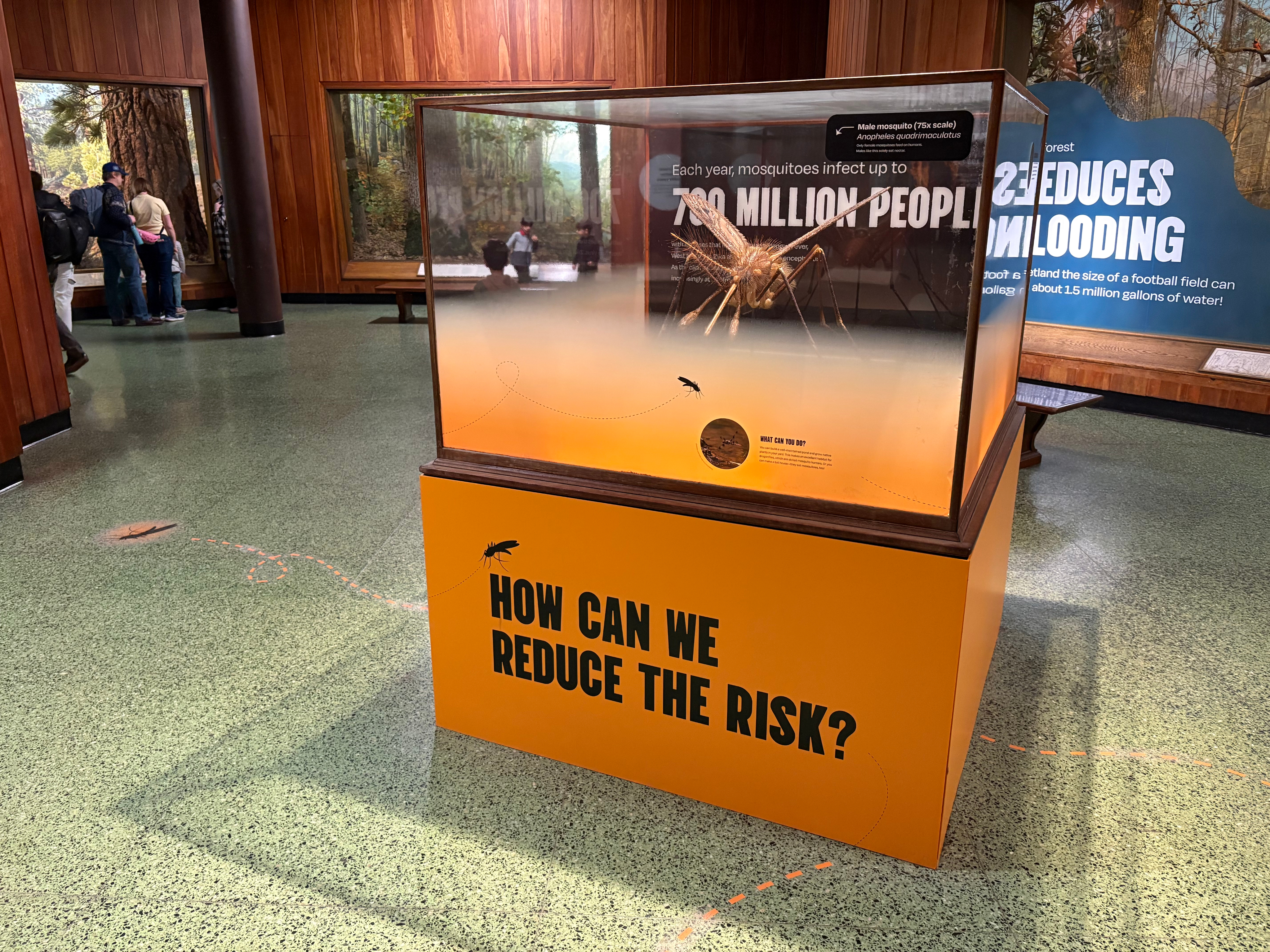 In the context of the forest hall, the mosquito was elevated into a focal graphic element that disrupted the viewer’s line of sight through exaggerated scale and placement. This treatment was purposefully bold and unmissable, designed to obstruct as a way to highlight the increasing prominence of vector species as environmental conditions evolve.